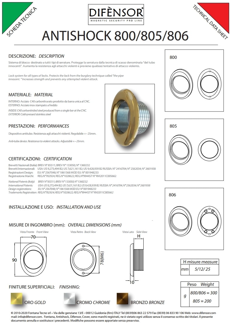 Antishock ECO 805Brevettato e con marchio registrato. Prodotto di sicurezza che evita l’attacco con il TUBO INNOCENTI. Creato al Centro di lavoro a controllo numerico direttamente da barra di acciaio unica. |